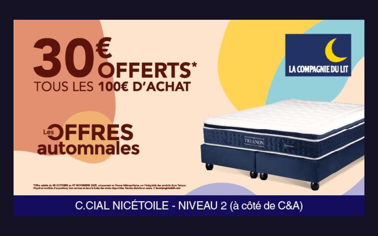 Profitez de 30€ de remise tous les 100€ d'achat sur de nombreux matelas, sommiers, ensembles literies et accessoires*